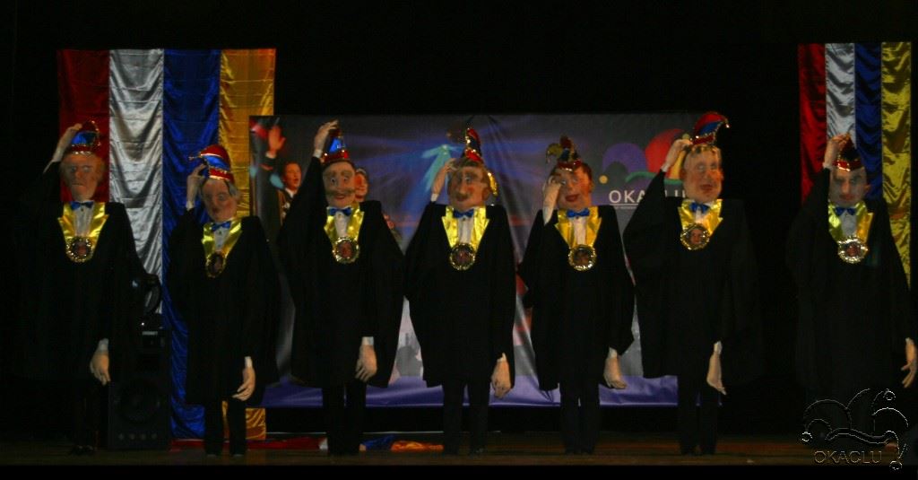 Zum Beginn der Show im Schweidnitzer Lyzeum begrüßte Präsident Hans-Peter Gärtner die über 500 Zuschauer sehr herzlich. Seine Ansprache wurde simultan ins Polnische übersetzt. Die Bühnenshow selbst allerdings moderierte er in Deutsch und Englisch. Der Präsident des OKACLU brauchte nur wenige Minuten, um den polnischen Freunden das "Dreifach donnernde Helau" zur närrsichen Beifallbekundung beizubringen. Dies war dann auch lautstark aus jedem Mund zu hören, als das amtierende Prinzenpaar Sebastian 1. und Prinzessin Barbara 1. auf der Bühne den Honoratioren des Kreises Swidnica seine prinzlichen Orden überreichte.