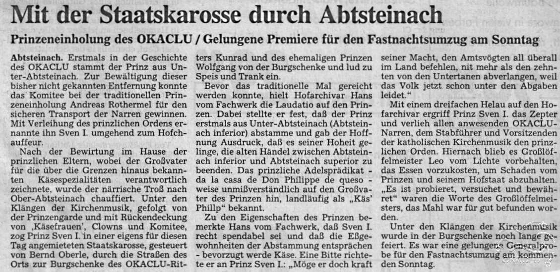 Eine Gruppe Mofafahrer eskortierte die Kanone, die, gefolgt von der katholischen Kirchenmusik Ober-Abtsteinach, das Prinzenschiff des OKACLU mit Prinz Sven I. und Prinzessin Annika I. und der Prinzengarde ankündigten. Ein Bonbonregen ergoss sich über die Zuschauer, das ausgelassene Treiben des Prinzenpaares steckte an.