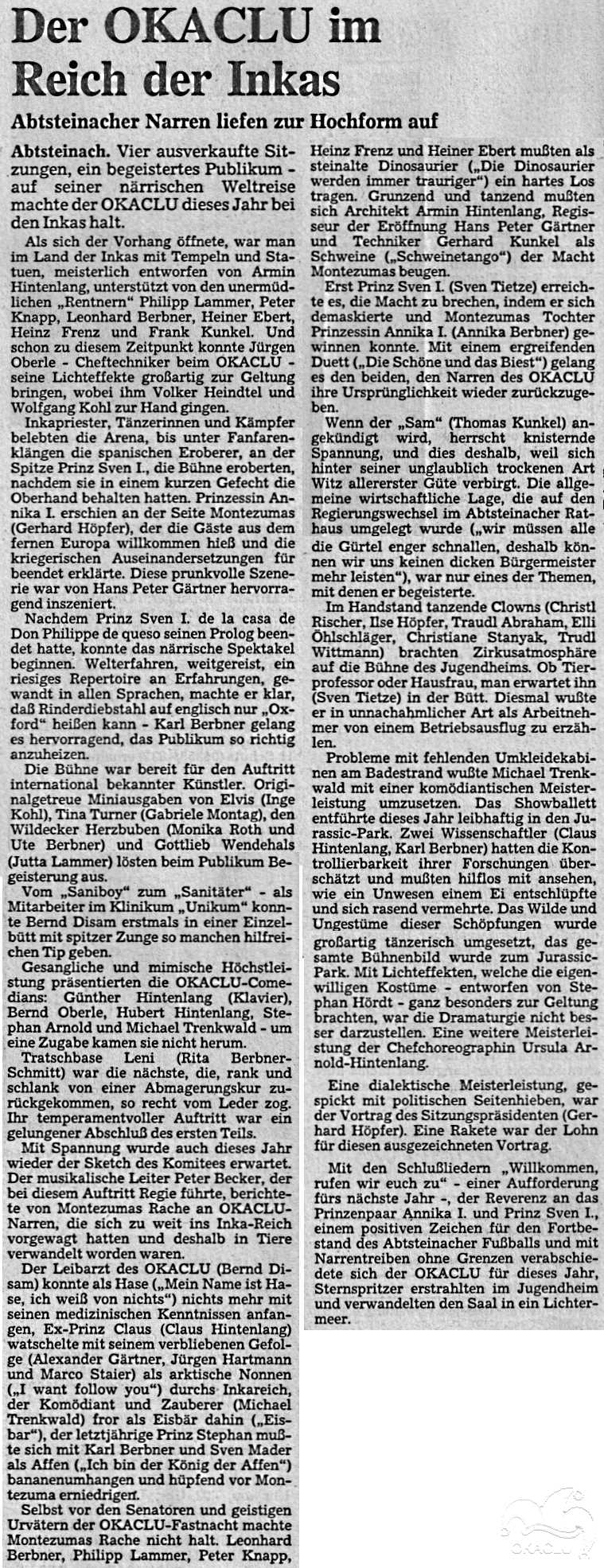 Bernd Oberle und Stephan Arnold sägten mit ihrer technischen Wundermaschine alles kurz und klein. Der TCA machte bildlich klar, dass es die ersten Tennisspieler schon in der Urzeit gab. Die Musikkapelle Unter-Abtsteinach führte eine andere Epoche an. Inkas aus dem fernen Südamerika folgten auf einem prunkvollen Wagen, der nochmals an die großartigen Sitzungen des OKACLU erinnerte, eine mexikanische Reitergruppe rundete das Bild temperamentvoll ab. Ein fliegender Teppich ist nicht nur im Orient zu bewundern. Leichtfüßig schwebte er durch die Straßen und lud die Zuschauer zum Mitfliegen ein.