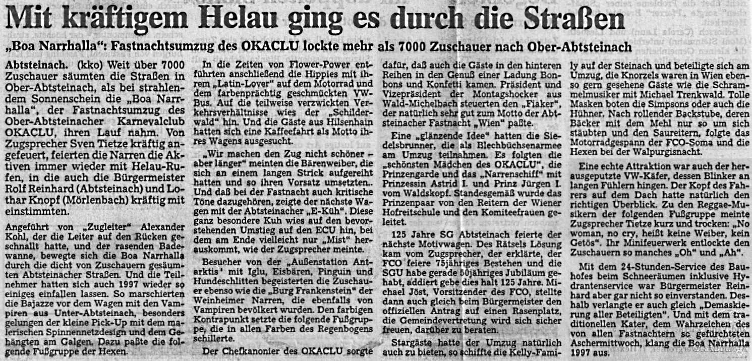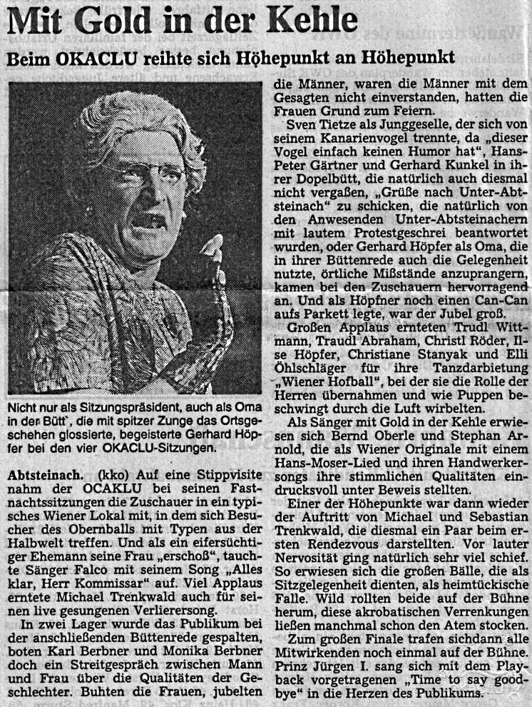 Pünktlich am 11.11. wurde auch in Ober-Abtsteinach, beim OKACLU, die neue Fastnachtskampagne eröffnet. Präsident Heinz Frenz begrüßte im Cafe Krapp die Ehrensenatoren, Komiteemitglieder sowie das Prinzenpaar der Kampagne 95/96, Prinz Alexander I. und Prinzessin Sylvia. An diesem Abend wurde traditionell auch das neue Prinzenpaar gekürt, Heinz Frenz stellte den Mitgliedern Prinz Jürgen I. vom Waldskopf und Prinzessin Astrid I. vor. Der Prinz verlieh nach der Gratulationscour seiner Hoffnung Ausdruck, dass die neue Kampagne ebenso erfolgreich verläuft wie die vergangene.