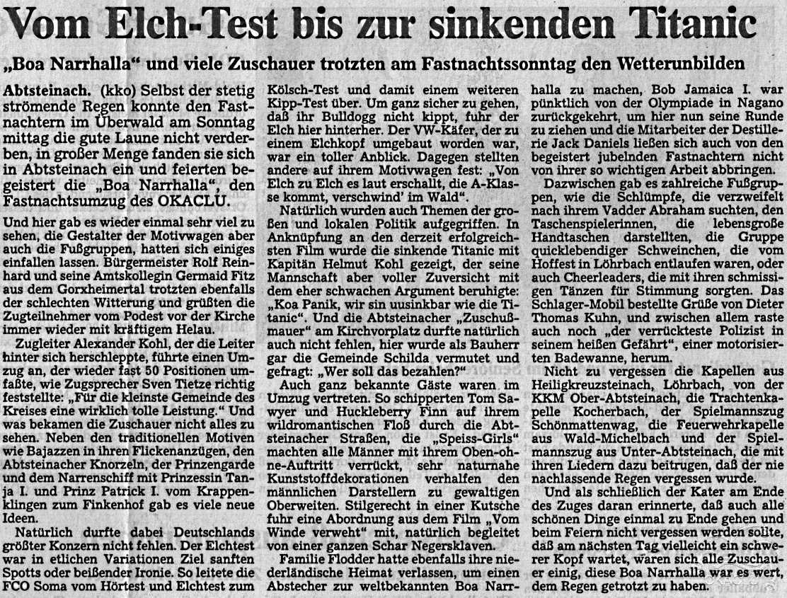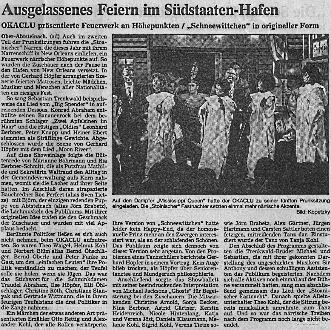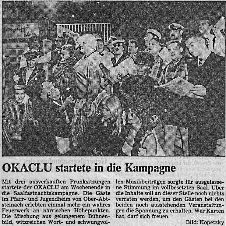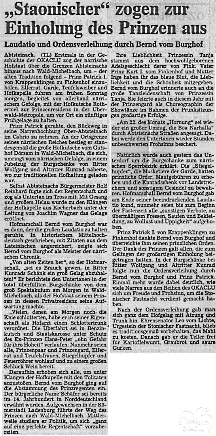 Wie es sich für echte Fastnachter gehört, startete auch der OKACLU pünktlich am 11.11. in die neue Kampagne. Traditionell wurde an diesem närrischem Datum das neue Prinzenpaar gekürt. Prinz Patrick I. vom Krappenklingen zu Finkenhof nahm die Prinzenpaar-Insignien im "Cafe Krapp" gemeinsam mit "Ihrer Lieblichkeit", Prinzessin Tanja I., in Empfang. Endgültig von der Last des närrischen Amtes befreit sind damit deren Vorgänger Jürgen I. vom Waldskopf und Astrid I., die den OKACLU in der letzten Kampagne als Prinzenpaar durch die Veranstaltungen führten. Bei der ersten offiziellen Zusammenkunft am Beginn der neuen Kampagne war die Stimmung unter den Fastnachtern in Ober-Abtsteinach bereits prächtig. Gute Voraussetzung also dafür, auch in dieser "fünften Jahreszeit" wieder mit einigen gelungenen Veranstaltungen unter der Regentschaft des neuen Prinzenpärchens aufwarten zu können