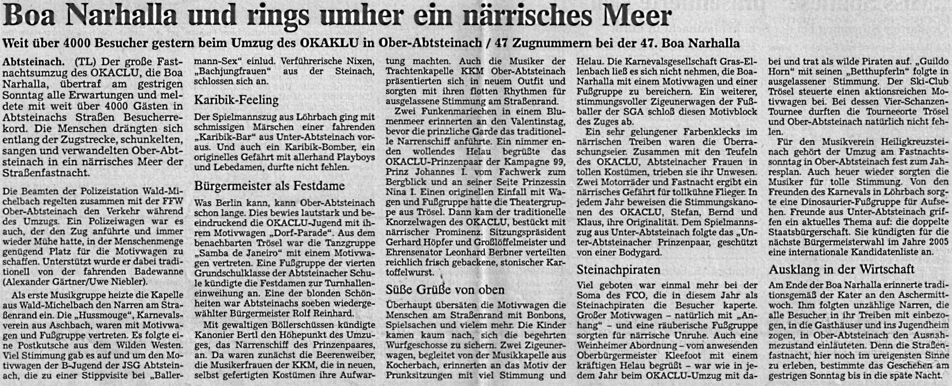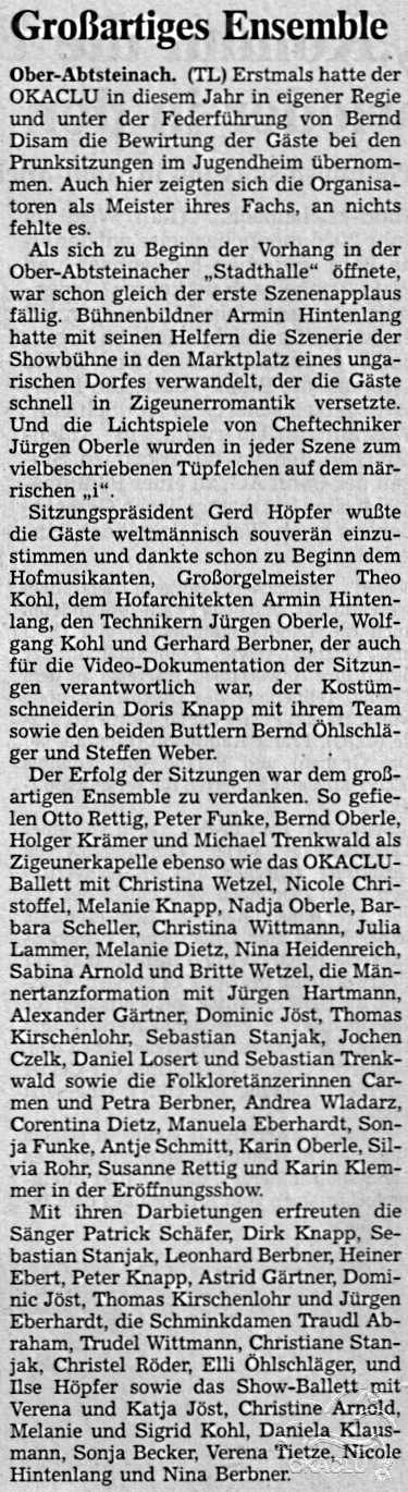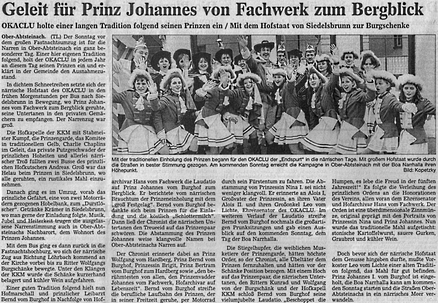 So hat das neue Prinzenpaar des OKACLU für die Kampagne 98/99, Prinz Johannes I. vom Fachwerk zum Bergblick und ihre Lieblichkeit Prinzessin Nina I. von seiner Herkunft her die besten Voraussetzungen, Narretei, Frohsinn und die Gabe, den Menschen Freude zu bereiten, lagen bei beiden mit in der Wiege. Den Narren in Ober-Abtsteinach und im ganzen vorderen Odenwald scheint eine großartige Kampagne bevorzustehen.