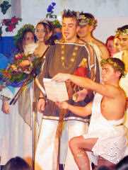 Im traditionellen Sketch des OKACLU-Komitees (Drehbuch und Regie Gerhard Höpfer) ging es um die Entführung von Helena, der anmutigen Tochter des reichen Griechen Noassis. Die Eröffnungsszene bot das Bild eines rauschenden Festes. Doch dann spulten die Akteure den „Film“ zurück.