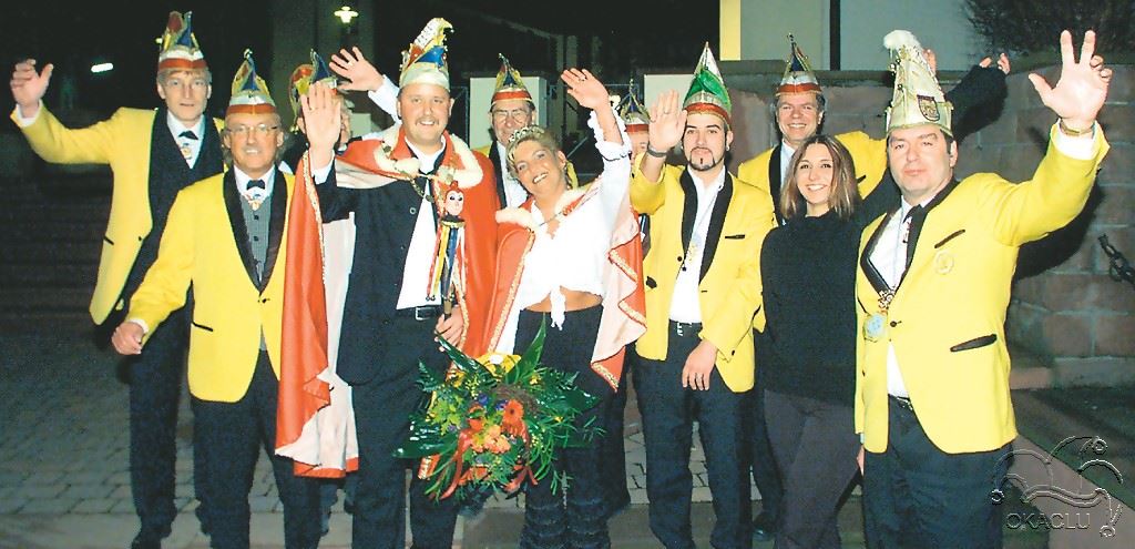 Pünktlich um 20.11 Uhr traf sich das OKACLU-Komitee nach altem Brauch im Café Krapp. Dieter Langhals, in Kennerkreisen kurz „die Maus“ genannt, intonierte auf seinem Akkordeon nach der langen Durststrecke für die Narren den ersten Narhallamarsch der närrischen Saison. OKACLU-Präsident Hans-Peter Gärtner konnte zum „Stoanischer Nationalfeiertag“ zahlreiche Narrenprominenz willkommen heißen. Seine besonderen Grüße galten den Ehrensenatoren Leonhard Berbner, Peter Knapp und Heiner Berbner, den „Oldies“ des Vereins, sowie dem scheidenden Prinzenpaar Jochen I. und Prinzessin Sonja II. Noch einmal würdigte der Präsident die Verdienste von Jochen und Sonja und dankte im Namen aller Narren für die zurückliegende Kampagne und überreichte die traditionellen Abschiedsgeschenke. Die beiden Fastnachtsoriginale Stefan und Bernd entledigten das scheidende Paar der närrischen Insignien und gaben diese frei für die Nachfolger.