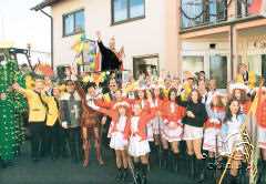 Die Hofmusikanten der Kirchenmusik kündigten den Abmarsch zur Burgschänke an. An den Straßenseiten verfolgten zahlreiche Besucher den Zug des gesamten närrischen Hofstaates durch die geschmückten Straßen Ober-Abtsteinachs. Prinz Otto fuhr hinter den Klängen der Musiker, hoch über seinen Untertanen, im Hebearm eines Radladers, gefolgt von allerlei Fatzköpfen und Possenreißern.