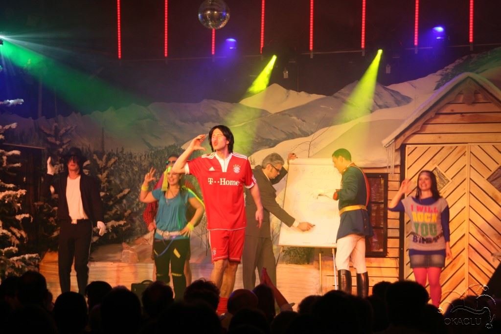 Ein Gipfelsturm der närrischen ArtAls sich der Vorhang öffnet, blicken die Besucher der OKACLU-Prunksitzungen 2010 auf eine alpine Landschaft mit einem idyllischen Bergdörfchen in effektvollen Lichterspielen in Szene gesetzt. Alphörner geben den Startschuss für ein Eröffnungsspektakel, bei dem Augen, Ohren und Lachmuskeln gleichsam auf ihre Kosten kamen.Umjubeltes PrinzenpaarNach mehrsprachiger Begrüßung durch Präsident Hans-Peter Gärtner und Moderator Sven Tietze erobern Heide mit Geisenpeter und Almöi sowie fesche Mädchen der Rettungswacht (Gardeballett) die Bühne. Kastelruther Dirndl und Tiroler Buben folgen. Stramme Männer stellen fest, das Skifahr`n der größte Hit sei und runden das alpenländische Treiben auf der Bühne zunächst ab. Feine Hofdamen schreiten auf die Bühne und tanzen mit ihren Partner zu einem Strauß-Walzer den Vogeltanz. Ihre Freude kündigen den Einzug des Prinzenpaares 2010 an. Mit komplettem Hofstaat ziehen Prinz Simon I. "vom Baderstuhl zum Prinzenthron" und ihre Lieblichkeit Prinzessin Meike I. unter großem Jubel durch den Saal auf die Bühne. Es erklingt das Mottolied der Kampagne: "Von den höchsten Alpengipfeln". Prinz Simon I. zieht schließlich mit seinem überaus betont und engagiert vorgetragenen Prolog in vollendetem Versmaß alle Narren im Saal in seinen Bann. Die Bühnenshow kann beginnen.Nonnen, Elvis und Kylie MinoqueFür den erfahrenen Vollblutfastnachter Karl Berbner als Odenwälder Karl ist die Eröffnungsbütt kein Problem. Schnell hat er alle Lacher im Saal auf seiner Seite und berichtet vom neuen Abtsteinacher Wahrzeichen, den "Mini-Twin-Towers", die Blitzanlagen am Netto-Markt. Neuigkeiten weiß er auch aus der Praxis des neuen Sexualtherapeuten in Wald-Michelbach. Die Gruppe "Schmink and Go", die fleißigen Stylistinnen hinter der Bühne, sind bei ihren Bühnenauftritten bekannt für originelle Ideen in effektvollen Kostümen. In diesem Jahr verwandeln sie sich tänzerisch und optisch von Nonnen zu Elvis-Doubles, von Kylie-Minoque-Doubles zu Ordensschwestern und von Jürgen Drews zu Marilyn Monroe. Aus Bozen in Tirol kommt Antonio (Jochen Czelk) zum Ober-Abtsteinacher Karnevalsclub. Unnachahmlich demonstriert er mit seinem Vortrag in perfektem "Ausländerdeutsch" sein großes humoristisches und schauspielerisches Talent. Auch ein "Zungenbrecher" als Zugabe bereitet ihm keinerlei Probleme. Beim Tanz der Dream-Girls, als flotte Ski-Hasen unterwegs, gehen die Gäste im Saal voll mit. Lang anhaltender Beifall gibt es für die verdienten Damen des OKACLU, die sich einmal mehr selbst choreographierten. Der letzte Auftritt vor der Pause ist bei den OKACLU-Prunksitzungen den drei Stammtischphilosophen (Michael Trenkwald, Karl Berbner und Dr. Claudius Disam) vorbehalten. Sie kommentieren das Orts- und Weltgeschehen auf besonders originelle Weise, wobei die Gegensätze der Bühnencharaktere für viel Esprit sorgen.Schuld ist die Ehefrau"Warum ist der Himmel ab und zu so herrlich blau?", will der Apotheker wissen. Die Antwort lässt nicht lange auf sich warten: "Weil er keine Frau hat, die es ihm verbietet." Ein anderer Stammtischbruder klagt sein eheliches Leid: "Je weniger Zähne meine Frau im Mund hat, desto bissiger wird sie." TLWesterwelle wohnt bei Mark MedlockAus der Feder von Sven Tietze stammt ein gleichermaßen skurriles und absurdes wie auch originelles Drehbuch für den traditionellen Sketch des Komitees nach der Pause. Das Spektakel "Aufgetaut und abgezockt" um den Märchenprinzen Ludwig von Bayern (Prinz Simon I.) bietet den Akteuren beste Möglichkeit ihre schauspielerischen, tänzerischen und musikalischen Talente zu zeigen. Prinz Ludwig, so die Story, der sich einst lebend einfrieren ließ, wird von Dr. D. aufgetaut. Schnell muss er feststellen, dass die Tiefkühlmaffia sein gesamtes Vermögen durchgebracht hat und er total verschuldet ist. Schuldenberater Peter Zwegat rät zum Verkauf der Königsschlösser. Schloss 1 geht an die Bundesregierung mit Kanzlerin Merkel, das Westerwelle alsbald mit Lebenspartner Mark Medlock bezieht. Dieter Bohlen mit seiner DSDS-Jury kauft Schloss Nummer 2. Michael Jacksons Sohn, ein Double seines Vaters, ersteht ein weiteres Königsschloss. Aus Schloss Herrenchiemsee wird mit Unterstützung der Supernanny Saalfrank ein Erziehungsheim für abtrünnige Fußballprofis und Luca Toni wird erster Fall. Restaurantfachmann Rach macht mit Hilfe von Tine Wittler aus Neuschwanstein ein Feinschmeckerrestaurant, Abtsteinachs neues Backhaus liefert täglich frische Backwaren.Spitze WortspieleSchließlich ist Ludwig schuldenfrei und verliebt sich hoffnungslos in seine Supernanny (Prinzessin Meike I.). Der Sketch, der alle Elemente eines Musicals enthielt, wurde einstudiert von Jürgen Hartmann, Sebastian Trenkwald und Otto Rettig. Thomas "Sam" Kunkel, bekannt als Meister des trockenen Humors, erzählt Neuigkeiten der Familie Lotter. Sein perfekter Vortrag ist eine einzige Gagtirade und wird mit rhythmischem Beifall vom Publikum honoriert. Charles mit seiner sprechenden Puppe Melvin ist eine Paradenummer für Sebastian Trenkwald und Jörn Brabez. Der begeisternde Vortrag, mit toller Pantomime gemischt, strapaziert einmal mehr die Lachmuskeln der Gäste. "Chefchen macht einen auf Tiger, die Wutz", ist eines vieler Beispiele spitzer Wortspiele, bei denen die beiden ihre Vielseitigkeit auf der Bühne beeindruckend unterstreichen. Als verzweifelter Patient besucht OKACLU-Original Michael Trenkwald in der letzten Bütt die Praxis von Dr. D in M. Im Wartezimmer hat er genügend Zeit, seine Erlebnisse in der ihm eigenen Vortragsart, bei der sich niemand des Lachens erwehren kann. So wurde er von einem Geisterfahrer von hinten gerammt.Mimik, die nur einer beherrschtZu den schulischen Leistungen eines Nachbarn stellte er fest: "Mit dem, was ihr Sohn alles nicht weiß, könnten locker fünf Kinder sitzen bleiben." Zu den Worttiraden des Vollblutfastnachters kamen Mimik und Gestik in einer Art, wie nur Michael 