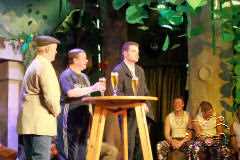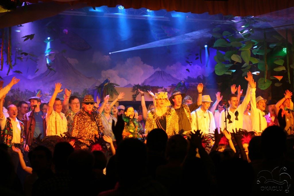 Die tropische Schwüle ist fast spürbarAls sich der Vorhang bei der Sitzung des OKACLU öffnete, blickten die Besucher auf ein faszinierendes Bühnenbild. Gleichsam einer lebenden Fotografie erinnerte die Dekoration an den tropischen Urwald am Amazonas. Das Publikum in Ober-Abtsteinach spürte beinah die Schwüle, hörte Affengebrüll und beobachtete bunte Papageien auf Riesenbäumen. Farne umspielten die Ruinen der „Affenstadt“ aus dem Dschungelbuch. Präsident Hans-Peter Gärtner und Moderator Sven Tietze begrüßten im „Indianer-Jones-Outfit“ die Gäste. Das Bühnenspektakel eröffnete die Schamanin „Rafika“ alias Moni Berbner in Anlehnung an das Erfolgsmusical „König der Löwen“. Die Eröffnung lud auf eine musikalische und tänzerische Reise durch die Dschungel dieser Erde ein. Nach den Ureinwohnern vom Yanomani-Stamm, die mit Trommelspiel und Tanz die Szenerie bevölkerten, erntete das Männerballett mit Prinz André an der Spitze lautstarken Applaus.Keine Sorgen um NachwuchsAls Botschafter der brasilianischen Fastnacht zeigte sich die junge Prinzengarde des OKACLU überaus anmutig und unterstrich beeindruckend, dass sich der OKACLU um seinen Nachwuchs keine Sorgen machen muss. Die Garde holte die Protagonisten des Abends mit dem gesamten närrischen Hofstatt am Saaleingang ab. Prinzessin Britta I. wurde die Ehre zuteil, auf einer Sänfte den Weg zur Showbühne zurückzulegen. Prinz André I. betrat als Löwe Simba die farbenfrohe Szenerie. An seiner Seite war Prinzessin Britta I. als Nala, die auch im realen Leben die Lebenspartnerin von Prinz André ist. In Anlehnung an einen Titel der Toten Hosen sangen die Akteure stimmgewaltig „An Tagen wie diesen erlebt man nur das Beste“. Besser als der „Odenwälder Karl“ alias Karl Berbner kann man die Feuertaufe der ersten Bütt des Abends nicht bestehen. Der Vollblutfastnachter hatte schon beim Einzug die Lacher auf seiner Seite und strapazierte mit seinen Tiraden die Lachmuskeln der Besucher. „Liebestöter“ und „Tanga-Höschen“ beschrieb er auf seine Weise: „Früher musste man(n) die Unterhosen zur Seite schieben, um den Hintern zu sehen, heute muss man(n) den Hintern zur Seite schieben, um die Unterhosen zu sehen.“ Einen gleichsam musikalischen wie pantomimischen Hochgenuss bescherten die OKACLU-Comedians den Besuchern der Prunksitzungen. In akkordreiner Sechsstimmigkeit intonierten sie als Don-Kosaken die russische Volksweise Wenn die Sonja russisch tanzt. In wochenlanger, akribischer Kleinarbeit mit künstlerischem und handwerklichem Geschick entstanden die faszinierenden Kostüme der Tanzgruppe „Schmink’n Go“, die als Tänzerinnen aus Rio de Janeiro mit dem Hit „Mossa, mossa“ alle begeisterten.Stammtisch als LachgarantZur Tradition geworden ist der „Stammtisch“. Hier wissen Karl, Michael und der Apotheker immer wieder Neues aus dem Orts- und Weltgeschehen zu berichten. Dass dabei so mancher sein närrisches Fett abbekommt, liegt auf der Hand. Das blinde Rollenverständnis der drei Stammtischbrüder für völlig unterschiedliche Charaktere lässt die Nummer jedes Jahr zu einem Lachgaranten werden.In Anlehnung an den Kinofilm Avatar kamen die OKACLU Dreamgirls unter der Leitung von Prinzessin Britta als Aliens auf die Bühne und interpretierten den Titelsong in einer emotionalen Choreografie. Für einen Höhepunkt sorgten Otto Rettig als Pfarrer, Petra Berbner als seine Haushälterin Mechthild und Alexander Kohl als Messdiener Jörg mit einer komödiantischen Meisterleistung. Sie verstanden es, die Besucher in Wort, Spiel und Mimik gleichermaßen zu begeistern. Otto Rettig hatte die Texte selbst mit spitzer Feder geschrieben. Ein Catwalk-Trainer in roten High HeelsDer traditionelle Sketch des OKACLU-Komitees nach der Pause wurde zu einem Spektakel, bei dem alle Akteure in ihren Rollen gleichsam aufgingen. Die Geschichte handelte von der Begegnung der Ureinwohner des Amazonasgebietes mit modernen, exzentrischen Zivilisationsmenschen. Dabei begleitete RTL „Explosiv“ ein Auswandererpaar aus Deutschland (das OKACLU-Prinzenpaar) in den Dschungel Südamerikas.Das verliebte Paar kommt in die Dschungelklinik von Professor Daktari, die mit der einstigen Klinik Albert Schweitzers nur wenig gemeinsam hat. Vielmehr kommen Promis aus aller Welt dorthin, um sich von Daktari und seinem Oberarzt Dr. Clarence, Daktaris Sohn, „verschönern“ zu lassen. Die attraktiven Lernschwestern Hanni und Nanni heizen die ohnehin schwüle und heiße Urwaldatmosphäre weiter auf. Zwei SteuerfahnderNach und nach treffen die Stars und Sternchen ein. Mogli aus dem Dschungelbuch, Cindy aus Mazahn, der Zalando-Bote, die Gruppe Trio, die Geissens aus Hollywood, Florian Silbereisen und der Catwalk-Trainer Jorge Gonzalez aus Kuba, der in extrem hohen High Heels seine Laufkünste unter Beweis stellt. Die Geschäfte des Dschungelarztes blühen. Das merkt auch das Finanzamt und schickt die zwei Steuerfahnder Starsky und Hutch.Als schließlich sogar Rambo zum Einsatz kommt, gibt Professor Daktari auf. Er wird verhaftet und abgeführt. Die Auswanderer nutzen die Gunst der Stunde, übernehmen die Klinik und erweitern das Angebot um einen Pizza-Service. Am Ende liegen sich Prinz André und Prinzessin Britta in den Armen und intonieren verliebt das Duett Dir gehört mein Herz. Pointen mit besonderer NoteVollblut-Fastnachter Jochen Czelk kam in diesem Jahr als Pizza-Bote Antonio. Sein mit Pointen gespickter Vortrag bekam durch die perfekte Interpretation des Protagonisten – Antonio spricht ein gebrochenes „Ausländerdeutsch“ – seine besondere Note. Als die Stimmungskanonen Philpp und Sepp (Stefan Arnold und Bernd Oberle) die Bühne betraten, standen die Besucher teilweise auf den Tischen. Sie hatten zwei neue Lieder mitgebracht. Mit Ja mir zwei und ihr dabei starteten die beiden, bevor sie das Publikum in ihren zweiten Titel Im Hühnerhaus mit einbezogen. Und als die beiden ihre Hymne No, mer gehn net Hoam anstimmten,