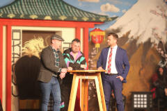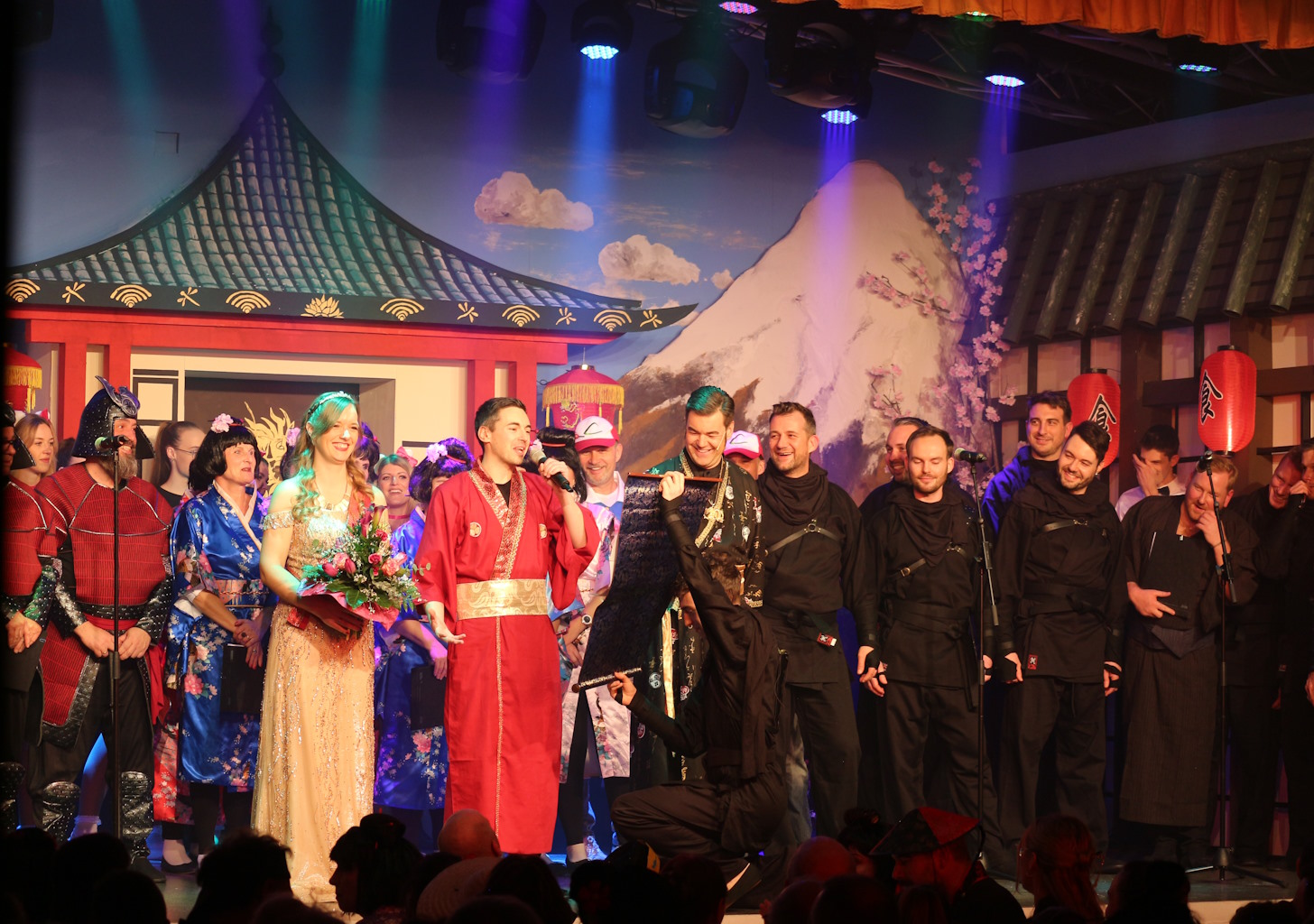 OKACLU entführt die Zuschauer in einen fernöstlichen KaiserpalastJapan ist das diesjährige Motto, und der OKACLU setzt das Thema in sieben ausverkauften Prunksitzungen nach typisch „Owwer-Stoanischer“ Manier hervorragend um. Über dem närrischen Spektakel thront majestätisch der Fuji und mehr als 2000 Zuschauer begleiten das Spiel der Akteure mit Begeisterung und viel Helau.Als der Vorhang sich nachts um halb eins langsam schließt, fragt man sich verwundert: Wer hat an der Uhr gedreht? Jeder Blockbuster hat Längen, aber der OKACLU (Ober-Abtsteinacher Karnevalsclub) schafft es mit einer tempo- und abwechslungsreichen Bühnenshow, dass die Stunden im Nu verfliegen und das Zeitgefühl außer Kraft gesetzt wird. Das liegt an der gewohnt vielschichtigen Mischung aus Tänzen, Sketchen, Büttenreden und Gesangsbeiträgen, bei denen auch die Zuschauer kräftig mitmischen. Jugendheim im Abtsteinach ist Schauplatz der OKACLU-Prunksitzungen Kein Zufall also, dass das Jugendheim, Schauplatz der Prunksitzungen, auch in diesem Jahr siebenmal ausverkauft ist. Mehr als 2000 Zuschauer begleiten das viereinhalbstündige Programm, das über 100 Mitwirkende des OKACLU auf die Beine gestellt haben. Doch bereits die Kulisse lohnt, genauer betrachtet zu werden: die Skyline der japanischen Metropole mit dem unermüdlich blinkenden Tokio-Tower. Daneben das traditionelle Tor zum kaiserlichen Palast und links ein bunter Nudel-Schnellimbiss. Über all dem thront der Fuji, umrankt von Kirschblüten. Tradition und Moderne aufs Beste vereint – das offenbart, mit wie viel Liebe zum Detail sich der OKACLU mit seinem diesjährigen Motto „Japan“ auseinandergesetzt hat. Die närrische Show ist fluoreszierend koloriert, was dank der fantastischen visuellen Lichteffekte richtig zur Geltung kommt. Verstärkt wird der Gesamteindruck von einer bemerkenswert professionellen Tontechnik – ein Klangerlebnis, das ins Staunen versetzt. Drache statt BoaHinzu gesellt sich die Bühnenpräsenz der einzelnen Aktiven des Vereins. Sie nehmen das Publikum mit, jeder auf seine Weise. Immer wieder gibt es ein Miteinander über die Bühnengrenze hinweg, ob beim Singen, Schunkeln oder wenn wohlvertraute und lieb gewonnene Figuren das Rampenlicht betreten. Auf den Punkt genau begleitet Theo Kohl den Abend mit Livemusik und treibt das Stimmungsbarometer bereits vor dem eigentlichen Sitzungsbeginn mit einer Schunkelrunde nach oben. Präsident Dr. Claudius Disam moderiert die Prunksitzungen zwischen den Stücken knapp und humorvoll, dabei rückt er die Eigenheiten Japans immer wieder ins Zentrum. Besonders kunstvoll spiegelt sich das Motto in den Kostümen wider: authentisch, aufwendig, zuweilen quietschbunt, aber stets detailverliebt. Modernes und klassisches Japan geben sich die Klinke in die Hand. Samurai aus der Edo-Zeit, Geishas und Ninjas treffen auf Manga-Superheldinnen, Hello Kitty und Pokémons. Weil es für die Boa Narhalla noch zu früh ist, schlängelt sich der tanzende Neujahrsdrache durchs Publikum hindurch.OKACLU hat ein Herz für „Flamingo Dolores“Sascha Bassauer verwandelt die Bütt wieder in einen Schulhof. In seiner Paraderolle als Lehrer plaudert er über seinen Alltag. Aus „verrückten Zeiten“ wird bei ihm eine „Zeit mit Verrückten“. Früher wusste man wenigstens, wer der Depp im Dorf ist. „Jetzt schießen sie wie Pilze aus dem Boden.“ Mehr noch: „Die Dummheit hat aufgehört, sich zu schämen“, sagt er nachdrücklich. Der Lehrer setzt eins drauf, als er sich die politisch korrekte Sprache vorknöpft („Soll aus Pippi Langstrumpf nun etwa eine urinierte Stretchsocke werden?“). Genauso kritisch sieht er die Anmachversuche heutiger Schüler („Hey Schnitte, schon belegt?“). Beim Gendern zuckt er in der Bütt nur noch mit den Schultern: „Das mach’ ich nicht, ich habe einen Schulabschluss.“Von Tom Beckenbach an der Gitarre begleitet, wird der selbst ernannte Pädagoge dann romantisch, als er das Schmachtlied über „Flamingo Dolores“ singt, an die er einst sein Herz verlor. Die erste Rakete des Abends von vielen startet. Um Liebe drehen sich die Gedanken der drei „Stammtischbrüder“ weniger, mehr um philosophische Fragen rund um das politische Zeitgeschehen. Dabei fallen ihnen aber auch ein paar seltsame Wortschöpfungen ein wie „transfinanziell“ („Ich bin ein reicher Mann im Körper eines armen Schluckers“). Auf das weibliche Geschlecht kommt das Trio, das seit dem Vorjahr in dieser Besetzung auftritt, schließlich doch noch zu sprechen: „Erst hat uns Gott an jeder Ecke schöne Frauen versprochen, dann hat er die Erde rund gemacht.“ Einen Ratschlag haben sie abschließend parat: „Man soll Frauen nie beim Schweigen unterbrechen.“ Trinkfreudige "Reha-Raketen"Die Retourkutsche kommt stimmgewaltig. Denn beim Austeilen gegen das andere Geschlecht sind die „Reha-Raketen“ erfinderisch und mindestens ebenso trinkfreudig. Doch ihr eigentlicher Feind heißt Diät. In grünen Smoothies wollen die drei Damen partout kein Genusserlebnis entdecken, auch wenn es noch so nett von Prinzessin Justine serviert wird: „Die haben ja nur 24 Vitamine, Jägermeister hat 56 Kräuter“. Erst als der attraktive Yogalehrer Sascha die Damen zum Dehnen mit „Katze“ und „Kuh“ ermuntert, erstürmen sie die Gymnastikmatten.In derlei Verrenkungen üben sich auch die „Seniorenbeauftragten“ des OKACLU. Petra Berbener mit Rollator und Vizepräsident Otto Rettig erklären in ihrem Oldie-Sketch, dass „Vorbeugen besser ist als zurücklehnen“, wobei sie es eher beim Frauenarzt versucht. Er hingegen schwärmt vom „einbeinigen Storch“ und „umherschauenden Rhinozeros“. Das Prinzenpaar Maximilian und Justine Hintenlang singen in einem Duett, dass sie „den OKACLU im Herzen“ tragen. Und die ewige Abtsteinacher „Rivalität“ zwischen Ober- (Max) und Unterort (Justine) lassen die beiden versöhnlich ausklingen: „Das ist gelebte Diversität“. Auf nach „Owwafutschi“